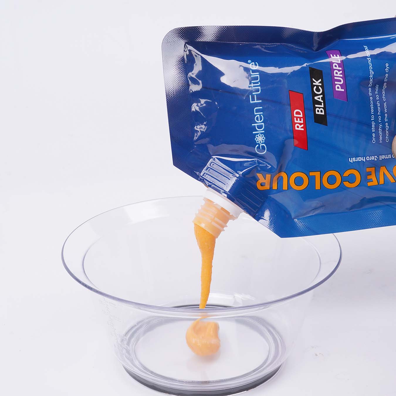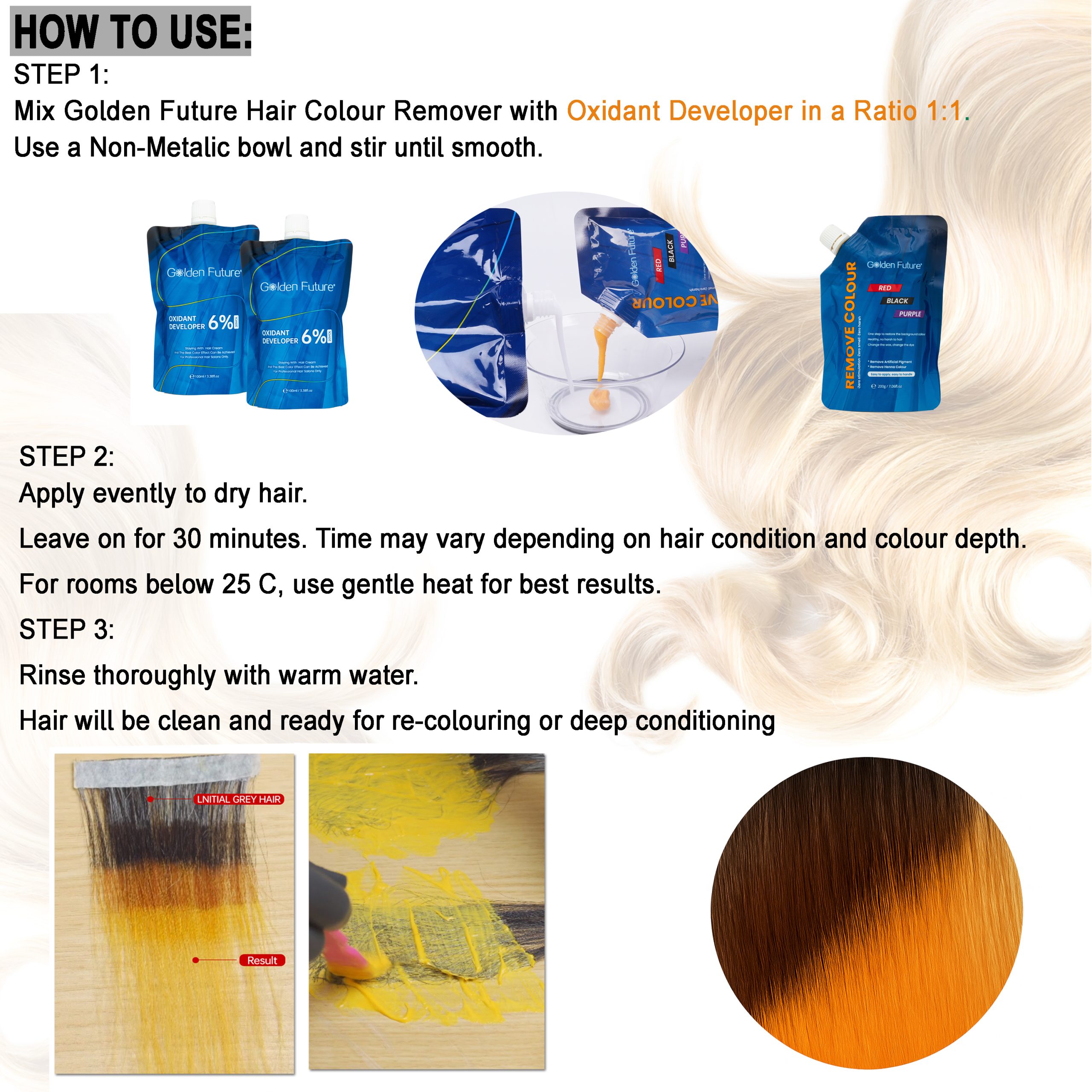 STEP 1 : Mix Golden Future colour remover with oxidant developer Use same amount ( it’s ok to use slightly more oxidant developer than colour remover but do not use less oxidant developer than the amount of colour ) Use a Non metallic bowl and still until smooth.